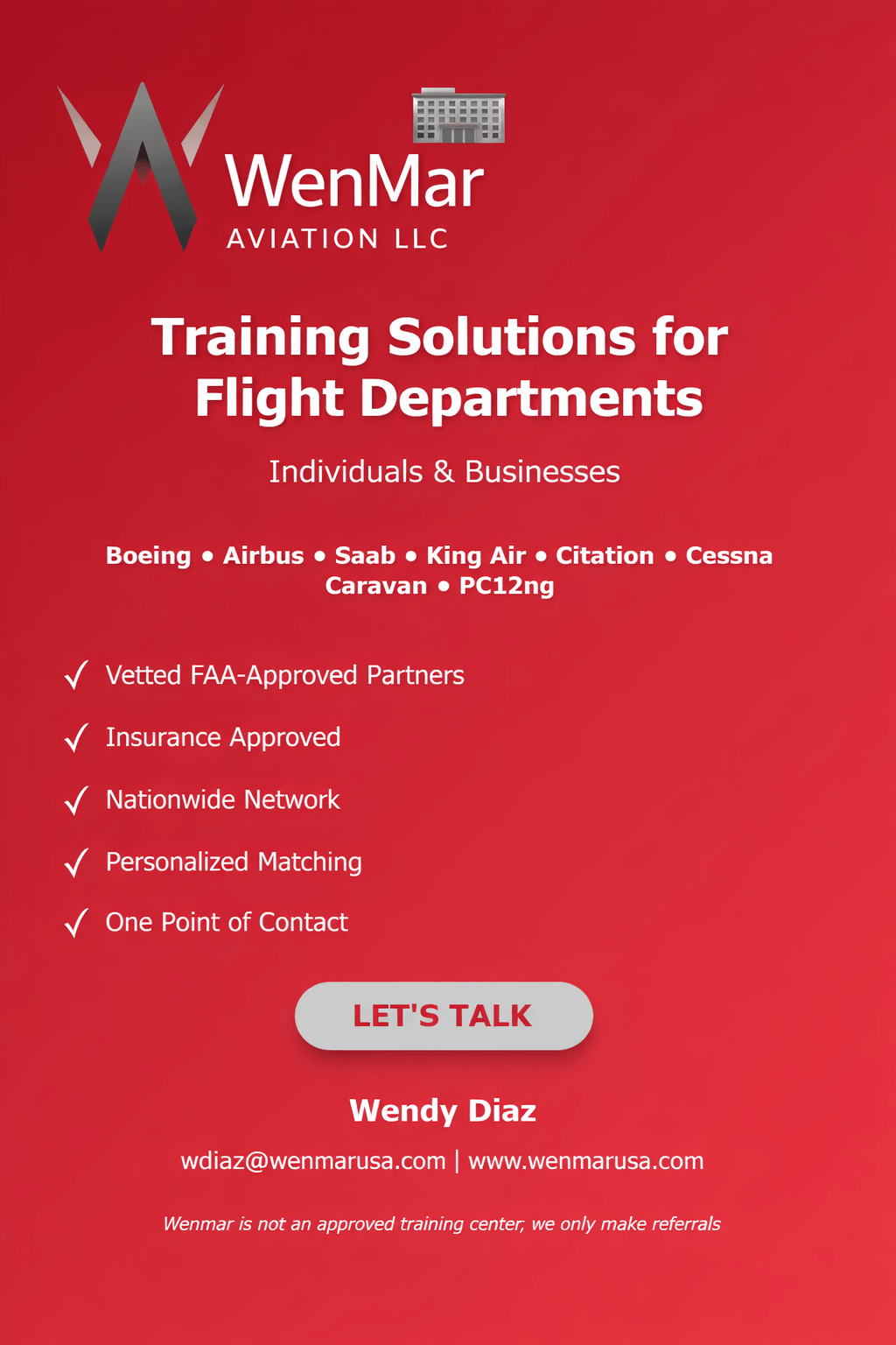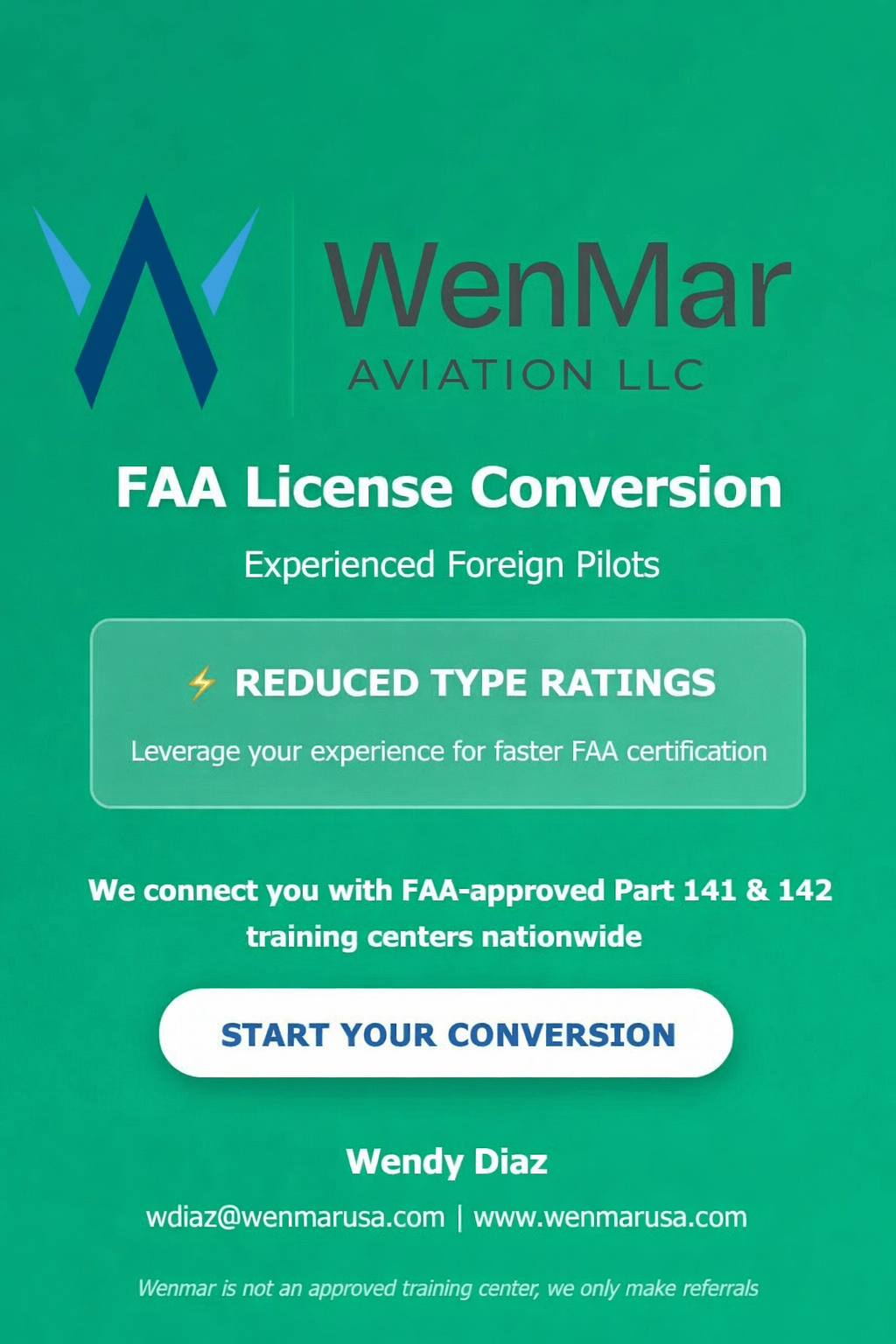 I would like to introduce myself, Wendy Diaz President and Founder for WenMar Aviation. My team and I have over 50 years experience in aviation operations and consultancy. I formed WenMar to specifically offer the new required FAA Designated Agent for Service for those FAA License holders or operators that do not have a United States physical address. This may not sound important but if you don’t respond to an official FAA communication your license, registration or permit can and will be revoked.